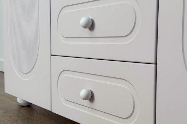 Корпус шкафа выполнен из ЛДСП толщиной 16 мм, фасады изготовлены из МДФ в плёнке ПВХ и декорированы фрезеровкой. Оригинальные круглые ручки и опоры подчёркивают стиль мебели и придают ей визуальную лёгкость.